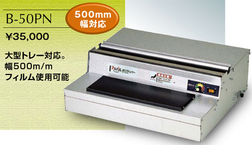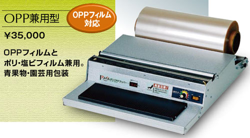 OPPフィルムと塩ビ・ポリフィルムの3種類の兼用型 青果物・園芸用包装 スイッチ切替による省エネ型 電 源 100V 機械寸法 504×600×131mm 熱板寸法 375×122mm フィルム幅 OPPフィルム使用時400mm×1000m (最大)塩ビ・ポリフィルム使用時450mm×1000m |