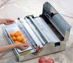 ポリ・塩ビ併用型 サイズ 475X433X175mm 最大フィルム寸法 450mm×750m 重量:5.3kg 最大紙管幅 466mm 100V 50/60Hz 165W ボックスタイプ